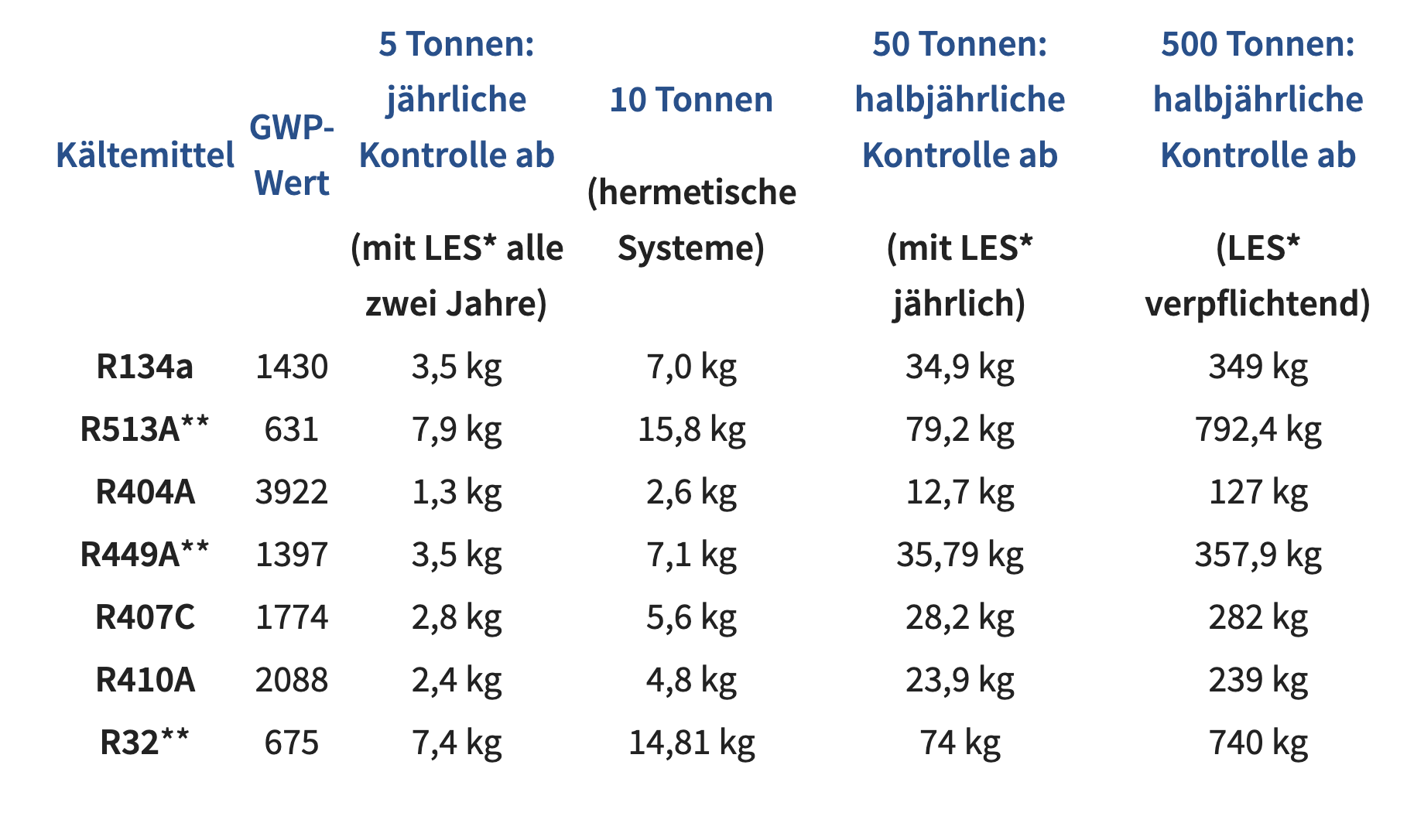 Anderes Beispiel: Eine Anlage ist mit 241 kg R410A gefüllt. Das GWP von R410A beträgt 2088. Multipliziert mit 241 kg ergibt sich ein CO2-Äquivalent von 503.208 kg also 503,2 t. -> Nach neuer Gesetzeslage ist damit die Anlage theoretisch vierteljährlich zu prüfen. Da sie gleichzeitig zwingend mit einem Leckage- Erkennungssystem auszustatten ist, halbiert sich diese Frist und die Anlage ist halbjährlich zu prüfen.