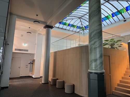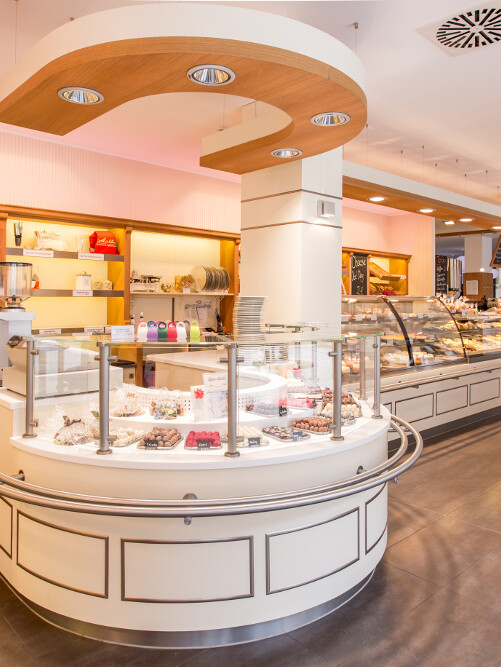 Es wurden 2 Tortenvitrinen, die Kühlwanne und Kontaktkühlplatte sowie die Speiseeistheke geliefert und Hand in Hand mit dem Ladenbau eingebaut. Die Rohrleitungen wurden in die Tiefgarage verlegt und die gelieferten und bauseitigen Kühlgeräte mit 2 deckenhängenden Aggregaten versorgt: