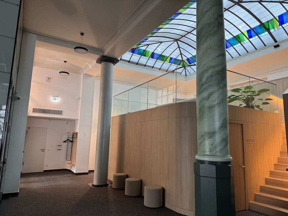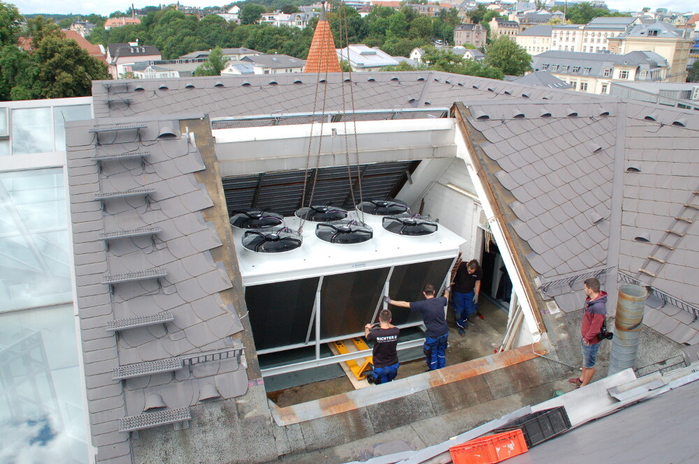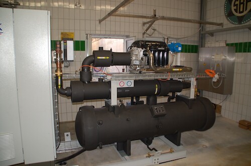 Diese arbeitet mit einem effizienten, leistungsgeregelten Verdichter mit Zylinderabschaltung von Bitzer mit angeschlossener DK Wärmerückgewinnung in einem großen Regelbereich von 10...100 %. Die bei der Kühlung aufgenommene Wärme wird auf einem nutzbaren Niveau von ca. 35 °C in der Wärmerückgewinnung für die Gebäudeheizung bereitgestellt und versorgt zum größten Teil das Gebäude mit der benötigten Wärmeenergie. Nur bei sehr kalten Außentemperaturen wird eine Ergänzungsheizung benötigt. Durch die auf dem Gebäude eingesetzte PV-Anlage wird ein großer Teil des für Kühlung und Beheizung benötigten Stroms nachhaltig selbst erzeugt.