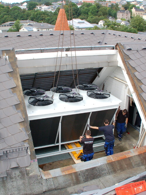 Der in die Jahre gekommene Kaltwassersatz im Modehaus Wöhrl in Plauen sollte mit neuer, energieeffizienter und dazu frostsicherer Technik erneuert und dabei die Leistung gleichzeitig erhöht werden.
